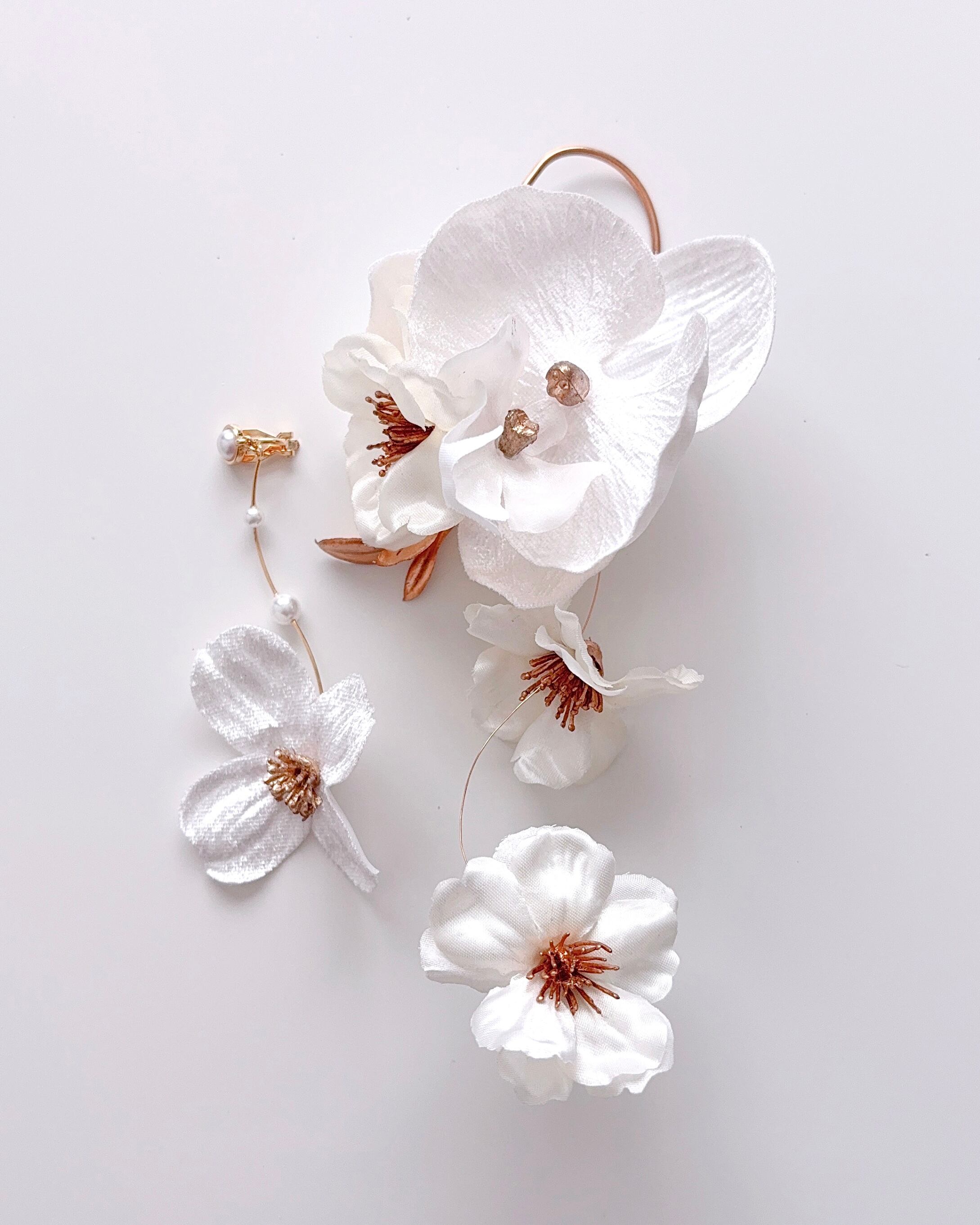そんなアーティシャルフラワーを用いてウェディングドレスをより華やかに特別に彩ってくれるフラワーイヤーカフを制作しました♡